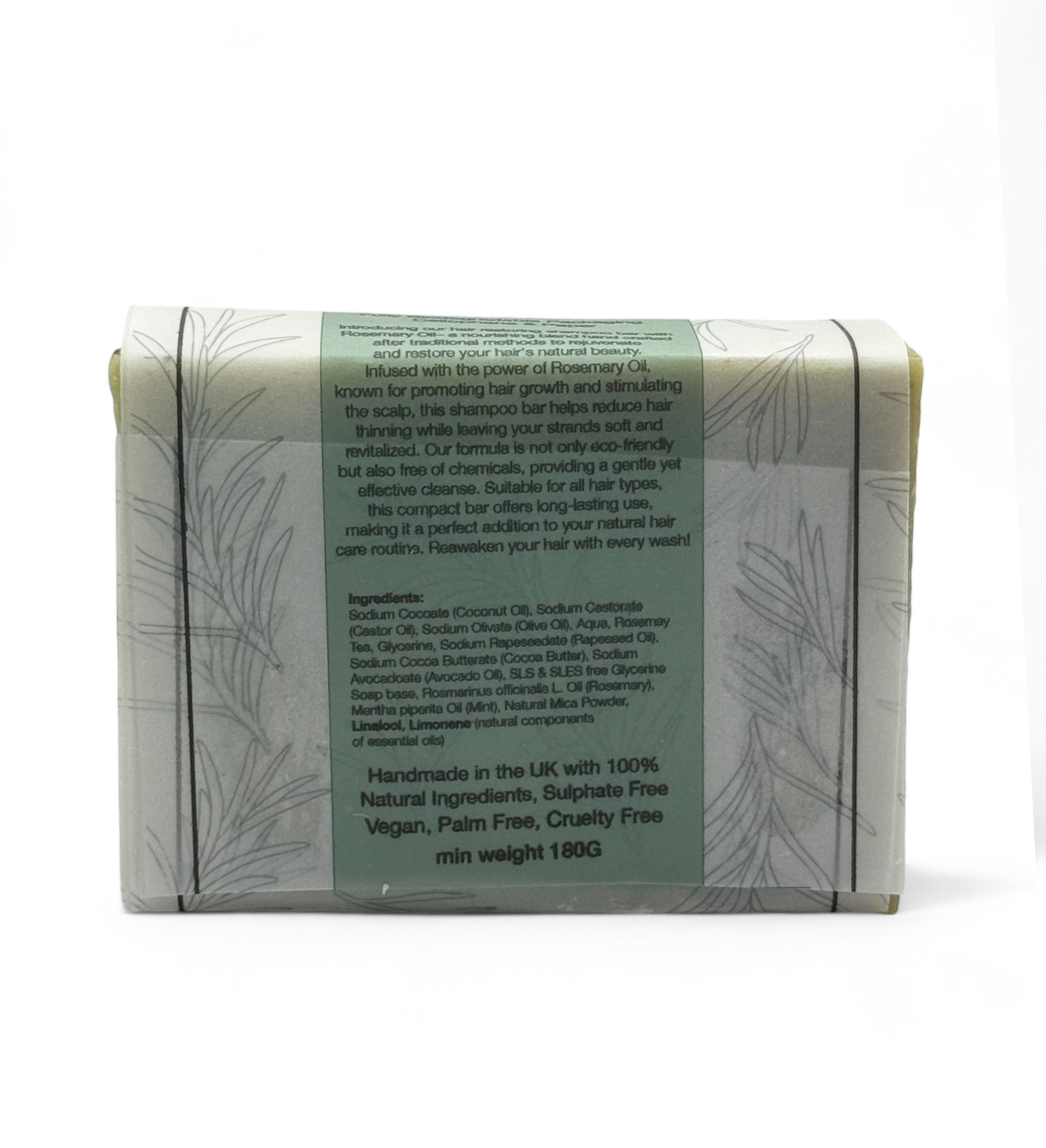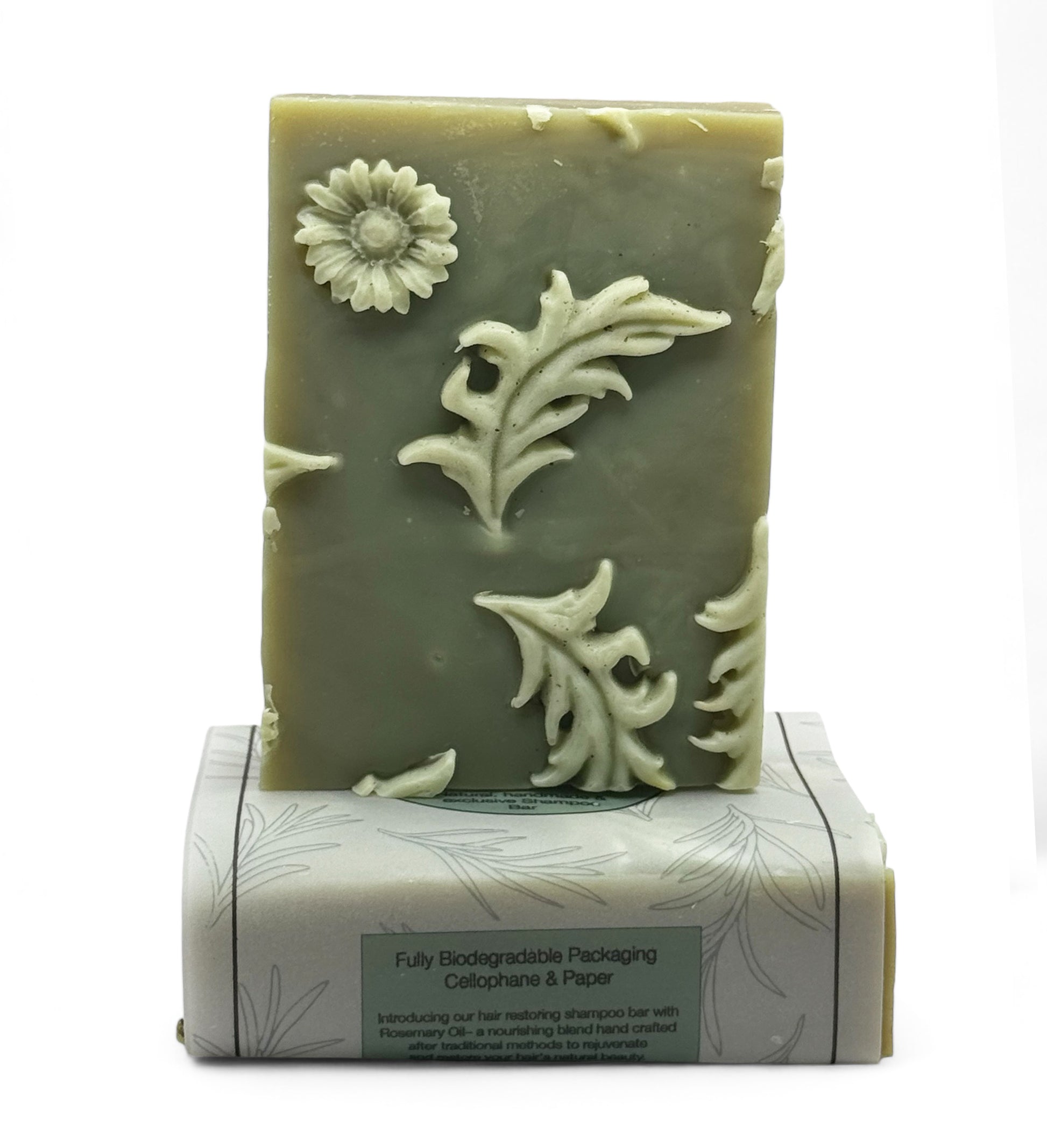Introducing our hair restoring shampoo bar with Rosemary Oil– a nourishing blend hand crafted after traditional methods to rejuvenate and restore your hair's natural beauty. Infused with the power of Rosemary Oil, known for promoting hair growth and stimulating the scalp, this shampoo bar helps reduce hair thinning while leaving your strands soft and revitalized. Our formula is not only eco-friendly but also free of chemicals, providing a gentle yet effective cleanse. Suitable for all hair types, this compact bar offers long-lasting use, making it a perfect addition to your natural hair care routine. Reawaken your hair with every wash!